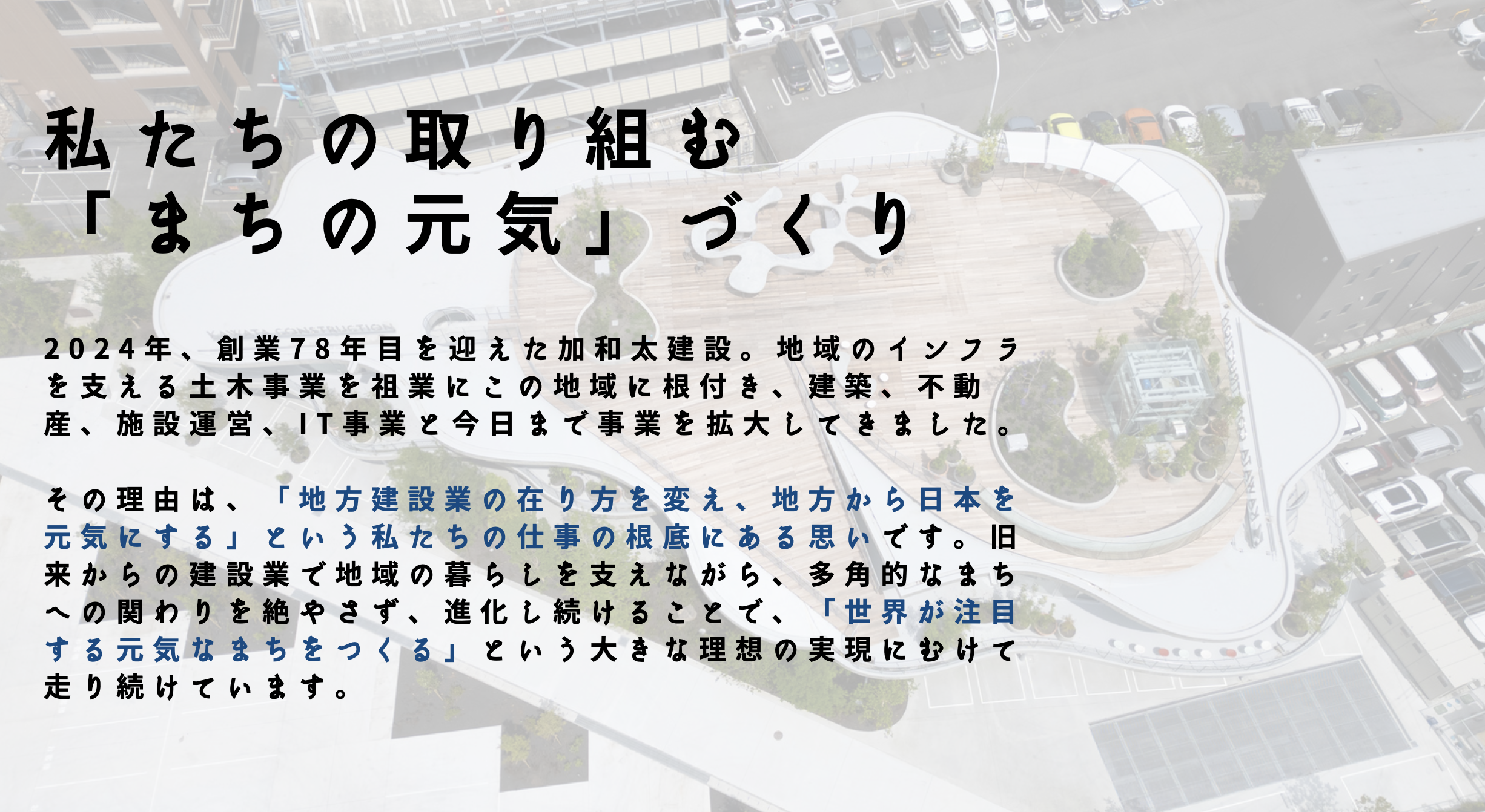 当社は「世界が注目する元気なまちをつくる」という目標を掲げ、土木・建築 、不動産、施設運営、ITなど幅広い事業を展開しています。